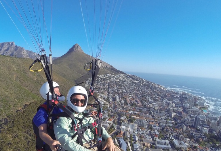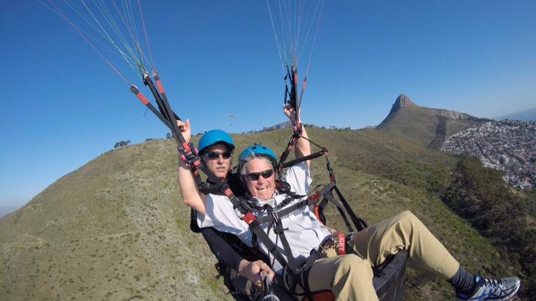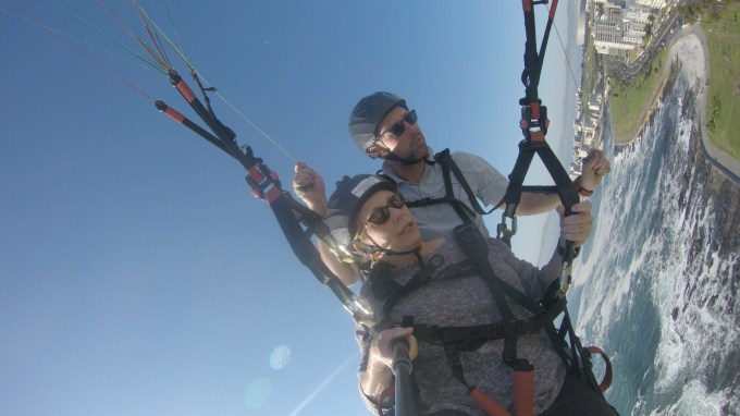 About the time we were finishing tea, I got a text that the winds had changed direction and that we could jump at 4pm. So we hopped in the car and head to Signal Mountain. He said that they only had 3 pilots that afternoon so only 3 of us could fly. Carol jumped at the opportunity to “watch!” The other 3 of us felt bad she wasn’t going to do it, but she said she actually felt very relieved. We met the guys that were to be our tandem flyers and after filling out some paperwork – I’m sure it was a liability release that I didn’t read – we were outfitted in paragliding gear, tethered up to the sail and off we went. Oh my gosh it was fabulous! Once you were in the air it was peaceful and quiet. I expected it to be noisy and windy, but it was like floating in still air….. The ride lasted 7 minutes, but it felt like only 2! The view was spectacular! We sailed over a beautiful residential area on the coast and after taking a couple of passes at the edge of the water we landed in a park by the ocean. It went by way to quickly for me!